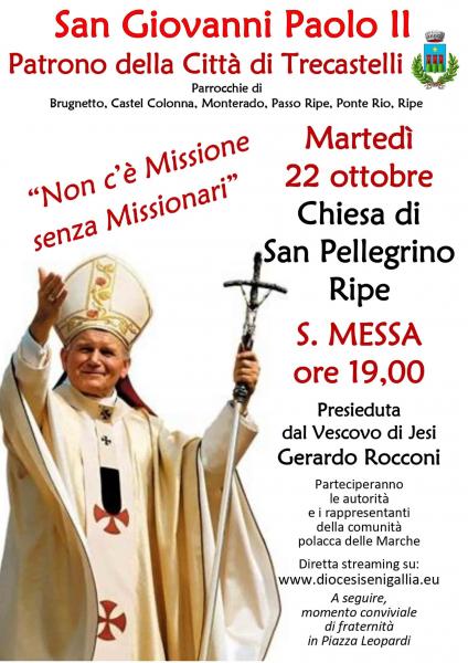Martedì 22 ottobre 2019, in occasione dell’importante commemorazione in onore di San Giovanni Paolo II, Patrono di Trecastelli, si terrà nella Chiesa Parrocchiale di San Pellegrino a Ripe di Trecastelli, alle ore 19.00, la Santa Messa presieduta dal Vescovo di Jesi Gerardo Rocconi.Alla cerimonia parteciperanno anche le autorità e i rappresentanti della Comunità Polacca delle Marche, in collaborazione con l’Istituto Polacco di Roma e l’Associazione Italo-Polacca Nuova delle Marche. La celebrazione, occasione di unione e aggregazione per tutti i cittadini di Trecastelli, sarà un momento per ricordare una figura così considerevole e beneamata come San Giovanni Paolo II, Papa dei giovani e della famiglia. Sono coinvolte le Parrocchie di San Pellegrino Vescovo e Martire di Ripe, Madonna del Rosario di Passo Ripe, San Michele Arcangelo di Brugnetto, San Mauro Abate di Castel Colonna, San Giacomo Maggiore di Monterado e la B.V. Maria del S.S. Rosario di Fatima di Ponte Rio. La Santa Messa in onore del Patrono di Trecastelli San Giovanni Paolo II sarà trasmessa in diretta streaming su www.diocesisenigallia.eu.