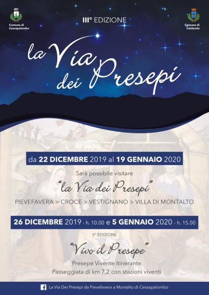 Gli abitanti delle frazioni di Montalto di Cessapalombo, Vestignano, Croce e Pievefavera in collaborazione con i Comuni di Cessapalombo e Caldarola (MC), sono lieti di invitarvi da Domenica 22 Dicembre 2019 a Domenica 19 Gennaio 2020 alla III°Edzione della "VIA DEI PRESEPI" dove durante queste settimane sarà possibile visitare i presepi (di tutte le dimensioni e materiali) creati dagli abitanti delle frazioni stesse. Inoltre vi invitano Giovedì 26 Dicembre h.10.00 e Domenica 5 Gennaio h.15.00 alla II° edizione di "VIVO IL PRESEPE" passeggiata di 7,2 km con stazioni viventi.