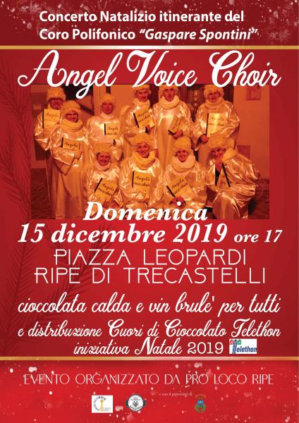 Domenica 15 dicembre 2019, alle ore 17, Pro Loco Ripe organizza a Trecastelli, in Piazza Leopardi nella località di Ripe, il Concerto Natalizio itinerante del Coro Polifonico “Gaspare Spontini” ANGEL VOICE CHOIR. L’atmosfera natalizia scenderà nel cuore della municipalità di Ripe e delle sue stradine, grazie a un gruppo che eseguirà, in costume e percorrendo i luoghi più significativi della località, i migliori canti della tradizione natalizia. Per accompagnare il pomeriggio di musica e di festa, saranno offerti al pubblico presente una buona cioccolata calda e il vin brulé, come da tradizione natalizia. Inoltre, chi lo desidera, potrà aderire all’iniziativa Telethon Natale 2019 che proporrà la distribuzione di Cuori di Cioccolato. La manifestazione è promossa da Pro Loco Ripe con il Patrocinio della Città di Trecastelli e vuole creare un momento di convivialità e aggregazione, in attesa del Natale, per i suoi cittadini e i visitatori. La partecipazione è a ingresso libero.