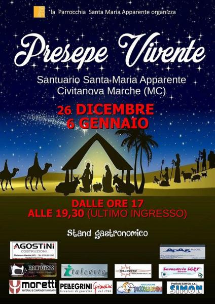 Vi troverete immersi nella Betlemme dell'anno zero e sarete accompagnati dalle nostre guide alla scoperta delle storie che incontrerete in un percorso lungo 2000 anni. Presso il bellissimo Santuario di Santa Maria Apparente del 1400 a Civitanova Marche. Ingresso libero ad offerta. Prima data il 26 dicembre. Si replica il 6 gennaio.