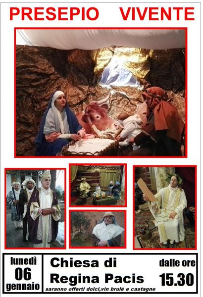 Tradizionale Presepe Vivente che si svolge nel Piazzale Antistante il Salone Parrocchiale ex chiesa di regina Pacis, con la partecipazione di figuranti con i mestieri antichi, natività e Re Magi. saranno offerti castagne arrosto, vin brulè ed i tradizionali biscotti della Befana.