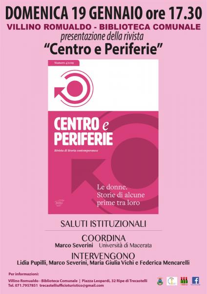 Domenica 19 gennaio 2020, alle ore 17.30, si terrà al Villino Romualdo di Trecastelli la presentazione del numero della rivista dell’Associazione di Storia ContemporaneaCENTRO e PERIFERIE intitolato “Le donne. Storie di alcune prime tra loro”. Dopo i saluti istituzionali, l’incontro sarà coordinato dal prof. Marco Severini dell’Università degli Studi di Macerata, Presidente dell’Associazione di Storia Contemporanea, e interverranno le autrici Lidia Pupilli, Maria Giulia Vichi e Federica Mencarelli. Il volume, interamente dedicato all’universo femminile, racconta la vita di un certo tipo di donne: quelle che, per prime, hanno voluto infrangere il privilegio maschile nelle professioni, nelle occupazioni e in molti altri settori. Donne che sono state protagoniste di vicende importanti e significative, che le autrici del volume hanno voluto ricordare, ricostruendone i percorsi di vita. Al termine della presentazione i relatori saranno disponibili per domande e riflessioni riguardanti le tematiche argomentate. L’evento è promosso dalla Città di Trecastelli ed è a ingresso libero.
