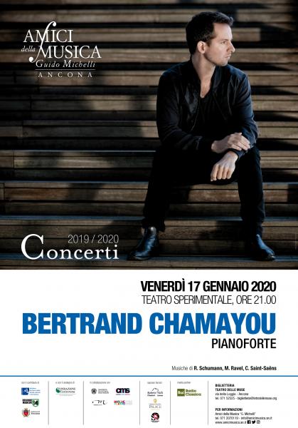 Un programma raffinato e sorprendente, che non mancherà di coinvolgere il pubblico, affidato ad un prestigioso talento della scuola pianistica francese: questo, in sintesi, il concerto che gli Amici della Musica di Ancona, in collaborazione con la rete Marche Concerti, hanno organizzato per venerdì 17 gennaio 2020, al Teatro Sperimentale, alle ore 21.00.Il pianista Bertrand Chamayou, definito "un principe dei pianisti", si è infatti ormai affermato ai massimi livelli della scena musicale internazionale e si esibisce nelle più importanti sale concertistiche come il Lincoln Center e la londinese Wigmore Hall, dove è stato spesso accompagnato da direttori del calibro di Pierre Boulez e Sir Neville Marriner. Le sue incredibili capacità virtuosistiche e la sua illimitata fantasia interpretativa daranno nuova vita a brani celeberrimi e lasceranno il pubblico letteralmente senza fiato!Programma del concertoROBERT SCHUMANN (Zwickau, 1810 – Endenich, 1856)Blumenstück, op. 19Carnaval op. 9***MAURICE RAVEL (Ciboure, 1875 – Parigi, 1937)Miroirs, M. 43CAMILLE SAINT-SAËNS (Parigi, 1835 – Algeri, 1921)Les cloches de las Palmas, da Sei studi op. 111