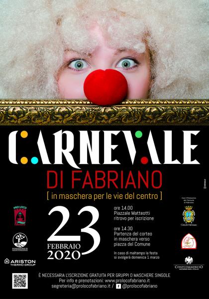 La Pro Loco Fabriano, con il supporto della "Fondazione Cassa di Risparmio di Fabriano e Cupramontana", dell' "Ariston Thermo Group", dell'Associazione "I Commercianti del Centro Storico di Fabriano", di "Confcommercio" e di alcuni privati, patrocinata dal Comune di Fabriano, organizza il "Carnevale di Fabriano" che si terrà domenica 23 febbraio 2020 a partire dalle ore 14.00.