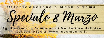 Cosa fare nel weekend dell'Otto Marzo? Indecisi tra un lungomare romantico, una passeggiata in campagna tra i mandorli in fiore o escursioni in montagna? Oppure preferireste indugiare sull'enogastronomia? Non c'è bisogno di scegliere! Vi proponiamo un finesettimana di relax tra le colline del Piceno,a un passo dal mare e a un'ora dai Monti Sibillini! Inoltre, il 7-8-9 Marzo, troverete a Fermo la 28a edizione di "Tipicità". ...e Sabato 7 Marzo a cena scoprirete un menù dedicato alla Mimosa, fiore simbolo della Festa della Donna! per informazioni e prenotazione 0734 939012 e info@lacampana.it Ecco le Offerte Speciali Weekend della Festa della Donna valide dal 5 al 10 Marzo all'Agriturismo La Campana In camera matrimoniale