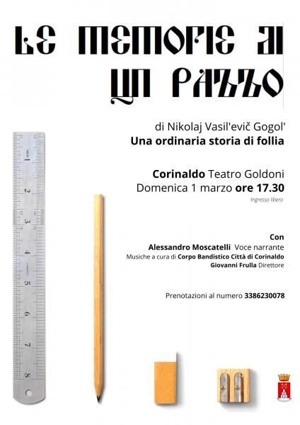 Una ordinaria storia di follia, di Nikolaj Vasil’evi? Gogol’, con Alessandro Moscatelli voce narrante, musiche a cura del Corpo Bandistico “Città di Corinaldo” diretto dal Maestro Giovanni Frulla. Ingresso libero.