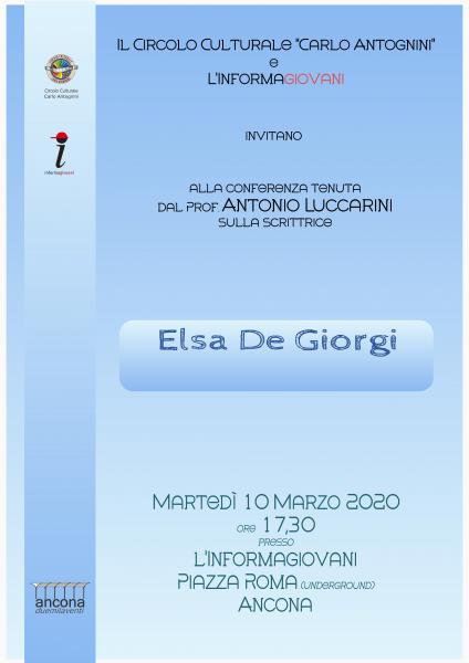 Per la festa della donna si va alla scoperta di Elsa de’ Giorgi, attrice, scrittrice, regista, nobildonna nativa di Pesaro, che a Roma trova la sua fortuna. Martedì 10 marzo alle ore 17,30 presso l’Informagiovani, piazza Roma, Ancona, ne parlerà il prof Antonio Luccarini, filosofo, ex assessore alla Cultura del Comune dorico. Nata nel 1914, Elsa de’ Giorgi, a Cinecittà interpreta molti film, gli ultimi dei quali diretta da Pierpaolo Pasolini (Salò) e Alberto Sordi. Si dedica al teatro, pubblica libri e svolge attività di critico teatrale. Diventa l’amante dello scrittore Italo Calvino. Il suo libro “I coetanei”, Einaudi, 1955, con uno scritto di Gaetano Salvemini, è premio speciale del Premio Viareggio. Muore a Roma nel 1997. La conferenza è organizzata dal circolo culturale Carlo Antognini in collaborazione con l’Informagiovani. Ingresso libero.