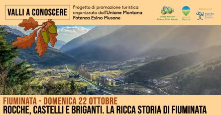 Fiuminata ha un territorio esteso e selvaggio, legato allo scorrere delle acque del fiume Potenza, terra di confine e di passaggio, ricca di storia e di meraviglie. Il vento soffia tra le rovine delle sue tante Rocche; quella di Santa Lucia - ristrutturata nel 2013 - sarà la prima tappa della nostra escursione. Incontreremo poi luoghi utilizzati come rifugio e deposito di armi dai briganti - come la Grotta dei Fucili - e valli impervie che ci accompagneranno lungo il cammino fino a raggiungere le mura e le case dei vecchi castelli medievali “antichi e immobili”. Rientrati dall’escursione visiteremo Fiuminata accompagnati da una guida turistica.