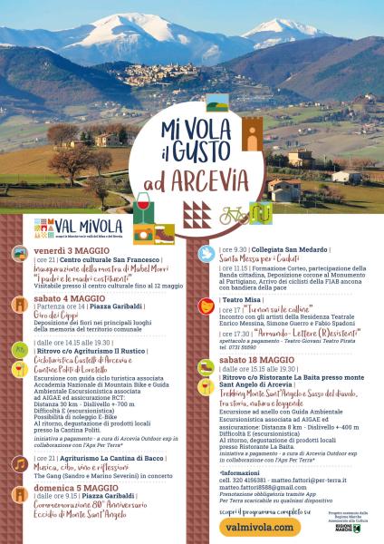 Inoltre, per gli amanti degli sport all’aria aperta, sabato 4 maggio e sabato 18 maggio Arcevia Outdoor exp, in collaborazione con l’Aps Per Terra ed il patrocinio del comune di Arcevia, propone due escursioni: la prima, un’esperienza cicloturistica ad anello adatto a mountain bike o gravel di alcuni castelli di Arcevia, tra strade secondarie, strade bianche e di campagna, attraversando parte del territorio arceviese per ammirare la bellezza della collina circostante. Durante l’escursione si visiterà il castello di Loretello, dove avrà luogo una degustazione di vino e olio di produzione propria presso le Cantine Politi, per poi visitare il castello di San Pietro, Palazzo e Caudino. La seconda, invece, è un’esperienza trekking ad anello tra leggende e storia del territorio: immersi nel verde del monte Sant’Angelo di Arcevia, lungo vecchie strade e sentieri attraversando boschi, pinete, ruderi e cave abbandonate, si giungerà al Sasso del diavolo per poi salire al santuario di San Michele Arcangelo dove si può godere di un'ampia vista dall'appennino al mare. Al rientro, per chi avrà il piacere, c’è la possibilità di degustare su prenotazione i piatti preparati appositamente dal ristorante “La Baita”.