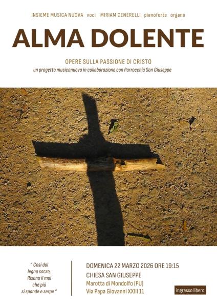 Da sabato 21 marzo 2026 si rinnova l'appuntamento della musica sacra nel tempo quaresimale con "Alma Dolente", concerti per voci e organo a cura dell'associazione Musica Nuova. Ornella Politi soprano, Marco Ferretti tenore, Carlo Giuseppetti baritono e Miriam Cenerelli pianoforte e organo proporranno un intenso percorso musicale che dalla Passione di Cristo si spinge fino all'anticipazione della gioia per la risurrezione pasquale. L'ascoltatore è guidato in una meditazione interiore dove parole e musica restituiscono la drammaticità della Passione colta attraverso gli occhi di Maria. Gli eventi, nati in collaborazione con la Pinacoteca Diocesana e grazie alla sensibilità di parroci e religiosi francescani, rientrano tra le iniziative culturali promosse per portare le suggestioni della musica nei luoghi di arte e spiritualità. I concerti, tutti ad ingresso libero, si svolgeranno a Ostra, Marotta, Senigallia e Pesaro.
