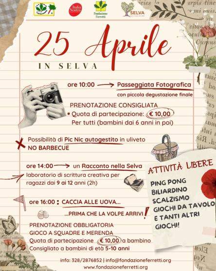 Torna il nostro 25 Aprile alla Selva: una giornata da vivere all’aria aperta tra giochi, relax, benessere e momenti di spensieratezza.Abbiamo preparato un programma pensato per tutti, nella speranza che la primavera ci regali una splendida giornata di sole.