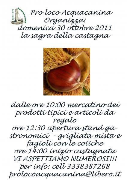 La Pro Loco di Acquacanina organizza per domenica 30 ottobre la Sagra della Castagna.Dalle ore 10, mercatino dei prodotti tipici e articoli da regalo.Alle 12.30, apertura stand gastronomici, con grigliata mista e fagioli con le cotiche.Alle 14, inizio della castagnata.