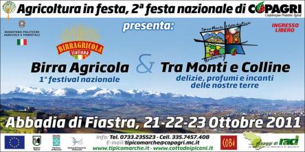 Dal 21 al 23 Ottobre 2011 nello splendido scenario della Riserva Naturale dell'Abbadia di Fiastra - Tolentino (MC) tre giorni all'insegna del bel vivere con incontri culturali, concerti, gastronomia, mostra mercato delle tipicità con oltre 50 espositori, spettacoli, folklore e tantissima birra di qualità (si chiama birra agricola perche gli ingredienti e tutto il processo di fermentazione vengono prodotti in azienda agraria) con oltre 50 tipologie diverse. UN APPUNTAMENTO DA NON PERDERE CON INGRESSO LIBERO. info: www.tipicomarche.it