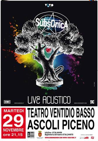 Per questa nuova avventura i Subsonica hanno scelto i teatri della penisola. La partenza sarà al Teatro Augusteo di Napoli lunedì 28 novembre, per poi continuare nei giorni successivi ad Ascoli Piceno, Cremona, Grosseto, Montecatini Terme, Ancona, Pescara, Matera.