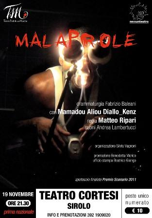 Lo spettacolo scritto in versi da Fabrizio Baleani vanta sonorità musicali scritte ad hoc che creano la traccia sulla quale si svolge l’azione. Mamadou sul palco è da solo a raccontarci la storia di un ragazzo, della sua famiglia… un fiorire dal ventre, una tavola imbandita. Il focolare. Luoghi in grado di strappare, con affetto, denti e unghie. Uno spazio claustrofobico, estraneo a ogni temperatura. Una stanza giocattolo dove maturare artificialmente. Familiari ossessivi che imboccano il figlio trentenne, il loro orgoglio. Malaprole è un trastullo ludico per occhi annoiati.