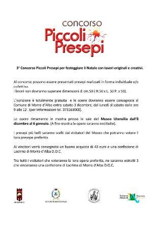 L'iscrizione è gratuita e le opere devono essere consegnate al Comune di Morro d'Alba entro sabato 3 dicembre, dal lunedì al sabato dalle 9 alle 12 (per informazioni 073163000).