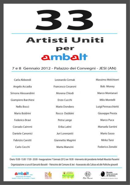 Verrà inaugurata sabato 7 Gennaio 2012, alle ore 18.00, presso i locali espositivi di Palazzo dei Convegni di Jesi, la mostra “33 artisti uniti per l'Ambalt”.