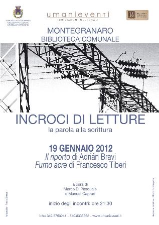 I due narratori saranno stimolati dalle note critiche e dagli interventi di Manuel Caprari, che solleciterà il pubblico alla riflessione sui testi che verranno letti durante la serata, tratti, per Bravi, dall’ultimo libro “Il riporto”, uscito nell’appena trascorso 2011 per la casa editrice Nottetempo, e per Tiberi, dalla sua opera prima “Fumo acre”, pubblicata nel 2010 dalla casa editrice marchigiana Montag.