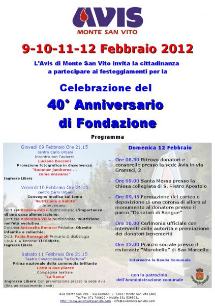L'Avis di Monte San Vito invita la cittadinanza a partecipare ai festeggiamenti per la Celebrazione del 40° Anniversario di Fondazione.