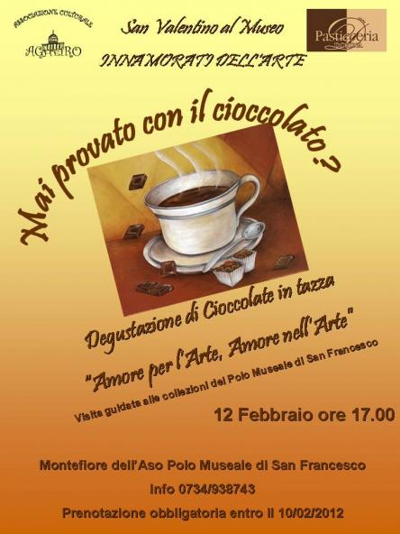 Per addolcire e riscaldare cuori e animi nel pomeriggio di domenica 26 febbraio, a partire dalle ore 17, l'Associazione Culturale Agheiro, in collaborazione con la Pasticceria Dorina di Montefiore dell'Aso, presenta "San Valentino al Museo. Innamorati dell'Arte...mai provato con il cioccolato?": una degustazione di cioccolate in tazza accompagnate da “chicche golose” realizzate dal famoso pasticcere montefiorano.