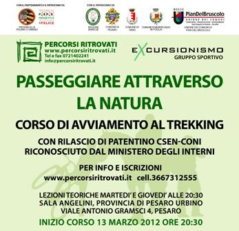 Seconda edizione del corso di avviamento al trekking "Passeggiare attraverso la natura", promosso dall’associazione Percorsi Ritrovati in collaborazione con il gruppo sportivo Excursionismo e con il partenariato della Provincia di Pesaro e Urbino e il patrocinio dei Comuni di Pesaro, Fano e Unione dei Comuni Pian del Bruscolo. Il corso si rivolge a tutti coloro che vogliono apprendere le nozioni fondamentali per potersi dedicare in assoluta sicurezza al trekking e all’escursionismo.