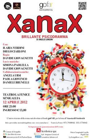 Ma "Xanax" è anche una commedia di Angelo Longoni, portata in scena dalla compagnia Teatro CLAET, con protagonisti Ilaria Verdini e Diego Ciarloni per la regia di Davide Giovagnetti. Racconta la storia di due persone che, costrette da un evento fortuito a un'interazione forzata, si rendono conto del peso della propria quotidianità specchiandosi l’uno nell’altra, il tutto affrontato con una buona dose di umorismo.