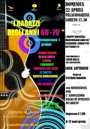 L’associazione “L’artista”, in collaborazione con l’associazione culturale “L’Arte Libera” e “Castelfidardo musica”, e con il patrocinio del comune di Loreto, organizza per domenica 22 aprile alle ore 17.30 al Palacongressi di Loreto lo spettacolo “I ragazzi degli anni '60 - '70”.