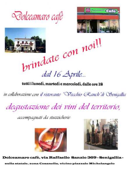 Al Dolceamaro Cafè di Senigallia, via R. Sanzio 369 (zona Cesanella), tutti i lunedì, martedì e mercoledì, dalle ore 18, degustazione di vini del nostro territorio. Ottima idea per un aperitivo accompagnato dalla musica e dalla simpatia di Daniela.